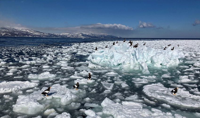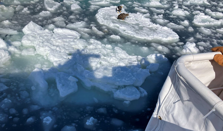 Setting out from Rausu Port, we were greeted by flocks of lively seagulls as we sailed for about 30 minutes. Soon, we entered the magnificent drift ice zone along the Rausu side of the Shiretoko Peninsula. The bluish ice floes were alive with the awe-inspiring sight of countless Steller’s sea eagles and white-tailed eagles, soaring and perched in majestic splendor. A truly unforgettable experience—Noripy was spellbound.