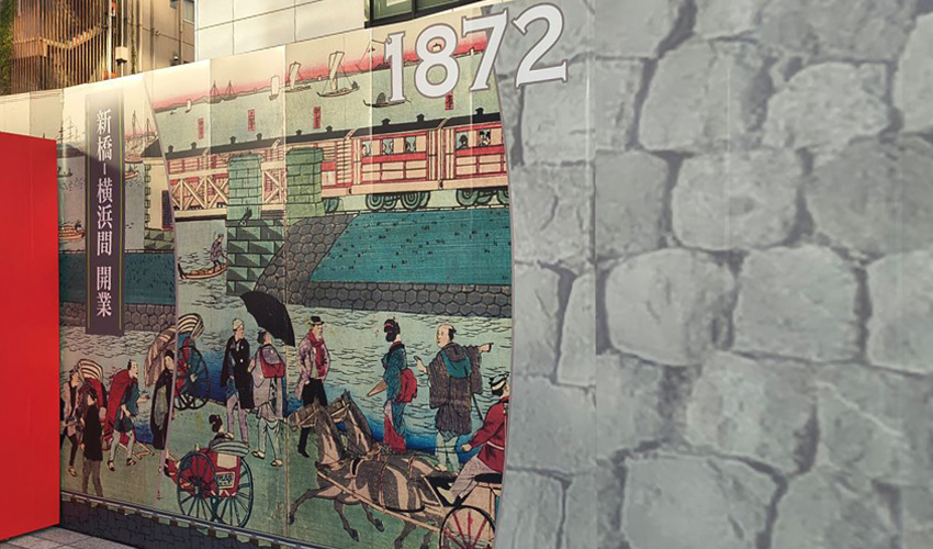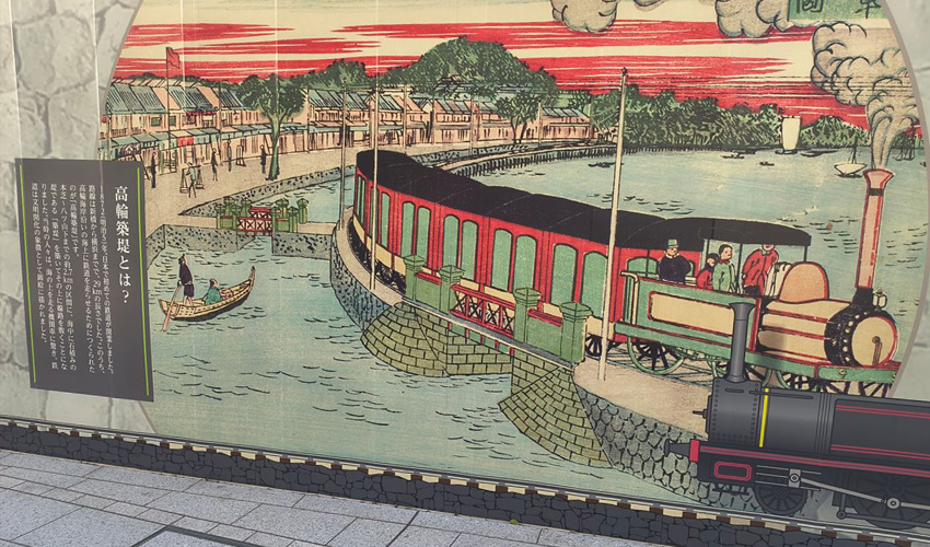 This is where Japan’s very first train once ran in the Meiji era. The remains of the embankment, built to allow the railway to pass over the sea, were discovered during construction of the new station.