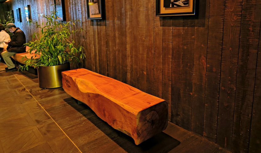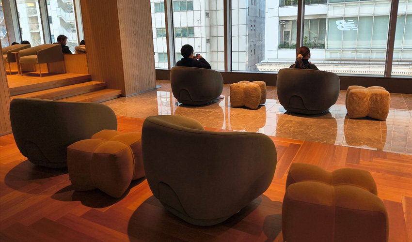 A variety of carefully designed seating appears to quietly encourage guests to pause, sit, and unwind.